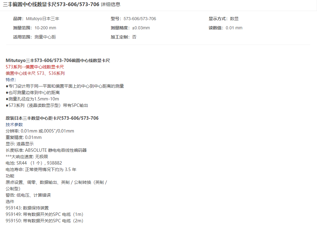 本網(wǎng)頁所展示的有關(guān)【三豐 573-606/573-706偏置中心線數(shù)顯卡尺】的信息/圖片/參數(shù)等由的會員【日本三豐mitutoyo-深圳柏萊科技有限公司 】提供,由柏萊儀器網(wǎng)-專業(yè)銷售儀器儀表服務(wù)商-深圳柏萊科技有限公司會員【日本三豐mitutoyo-深圳柏萊科技有限公司 】自行對信息/圖片/參數(shù)等的真實性、準確性和合法性負責,本平臺(本網(wǎng)站)僅提供展示服務(wù),請謹慎交易,因交易而產(chǎn)生的法律關(guān)系及法律糾紛由您自行協(xié)商解決,本平臺(本網(wǎng)站)對此不承擔任何責任。您在本網(wǎng)頁可以瀏覽【三豐 573-606/573-706偏置中心線數(shù)顯卡尺】有關(guān)的信息/圖片/價格等及提供 【三豐 573-606/573-706偏置中心線數(shù)顯卡尺】的商家公司簡介、聯(lián)系方式等信息。