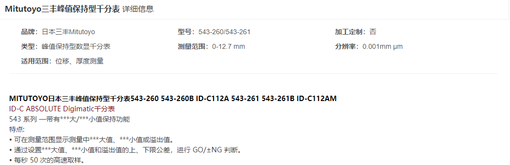 本網(wǎng)頁所展示的有關【三豐 峰值保持型千分表】的信息/圖片/參數(shù)等由的會員【日本三豐mitutoyo-深圳柏萊科技有限公司 】提供,由柏萊儀器網(wǎng)-專業(yè)銷售儀器儀表服務商-深圳柏萊科技有限公司會員【日本三豐mitutoyo-深圳柏萊科技有限公司 】自行對信息/圖片/參數(shù)等的真實性、準確性和合法性負責,本平臺(本網(wǎng)站)僅提供展示服務,請謹慎交易,因交易而產(chǎn)生的法律關系及法律糾紛由您自行協(xié)商解決,本平臺(本網(wǎng)站)對此不承擔任何責任。您在本網(wǎng)頁可以瀏覽【三豐 峰值保持型千分表】有關的信息/圖片/價格等及提供 【三豐 峰值保持型千分表】的商家公司簡介、聯(lián)系方式等信息。