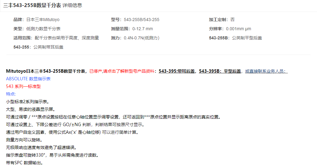 本網(wǎng)頁所展示的有關(guān)【三豐 543-255B數(shù)顯千分表】的信息/圖片/參數(shù)等由的會員【日本三豐mitutoyo-深圳柏萊科技有限公司 】提供,由柏萊儀器網(wǎng)-專業(yè)銷售儀器儀表服務(wù)商-深圳柏萊科技有限公司會員【日本三豐mitutoyo-深圳柏萊科技有限公司 】自行對信息/圖片/參數(shù)等的真實性、準確性和合法性負責,本平臺(本網(wǎng)站)僅提供展示服務(wù),請謹慎交易,因交易而產(chǎn)生的法律關(guān)系及法律糾紛由您自行協(xié)商解決,本平臺(本網(wǎng)站)對此不承擔任何責任。您在本網(wǎng)頁可以瀏覽【三豐 543-255B數(shù)顯千分表】有關(guān)的信息/圖片/價格等及提供 【三豐 543-255B數(shù)顯千分表】的商家公司簡介、聯(lián)系方式等信息。