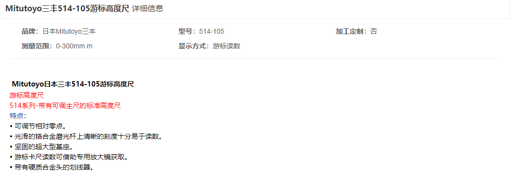 本網(wǎng)頁(yè)所展示的有關(guān)【三豐 514-105游標(biāo)高度尺】的信息/圖片/參數(shù)等由的會(huì)員【日本三豐mitutoyo-深圳柏萊科技有限公司 】提供,由柏萊儀器網(wǎng)-專業(yè)銷售儀器儀表服務(wù)商-深圳柏萊科技有限公司會(huì)員【日本三豐mitutoyo-深圳柏萊科技有限公司 】自行對(duì)信息/圖片/參數(shù)等的真實(shí)性、準(zhǔn)確性和合法性負(fù)責(zé),本平臺(tái)(本網(wǎng)站)僅提供展示服務(wù),請(qǐng)謹(jǐn)慎交易,因交易而產(chǎn)生的法律關(guān)系及法律糾紛由您自行協(xié)商解決,本平臺(tái)(本網(wǎng)站)對(duì)此不承擔(dān)任何責(zé)任。您在本網(wǎng)頁(yè)可以瀏覽【三豐 514-105游標(biāo)高度尺】有關(guān)的信息/圖片/價(jià)格等及提供 【三豐 514-105游標(biāo)高度尺】的商家公司簡(jiǎn)介、聯(lián)系方式等信息。