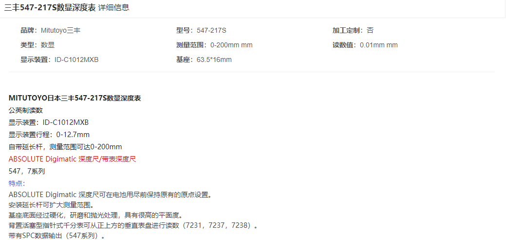 本網頁所展示的有關【三豐 547-217S數顯深度表】的信息/圖片/參數等由的會員【日本三豐mitutoyo-深圳柏萊科技有限公司 】提供,由柏萊儀器網-專業(yè)銷售儀器儀表服務商-深圳柏萊科技有限公司會員【日本三豐mitutoyo-深圳柏萊科技有限公司 】自行對信息/圖片/參數等的真實性、準確性和合法性負責,本平臺(本網站)僅提供展示服務,請謹慎交易,因交易而產生的法律關系及法律糾紛由您自行協商解決,本平臺(本網站)對此不承擔任何責任。您在本網頁可以瀏覽【三豐 547-217S數顯深度表】有關的信息/圖片/價格等及提供 【三豐 547-217S數顯深度表】的商家公司簡介、聯系方式等信息。