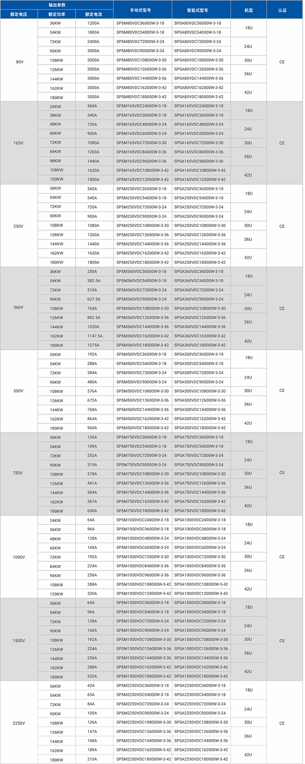 大功率直流電源系統(tǒng)根據(jù)控制方式有手動式(SPSM)和智能式(SPSA)兩個系列。單個電源機櫃輸出範圍可達2250V,3000A,180kW。支持多個機櫃主從并聯(lián)擴容系統(tǒng)功率可達576kW。