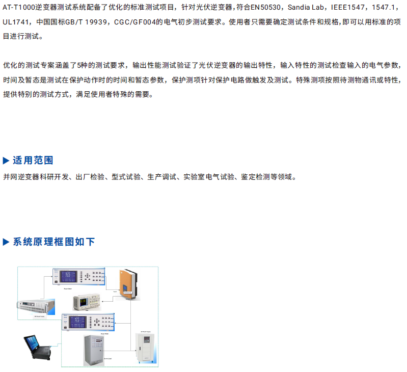 適用于并網(wǎng)逆變器科研開(kāi)發(fā)、出廠檢驗(yàn)、型式試驗(yàn)、生産調(diào)試、實(shí)驗(yàn)室電氣試驗(yàn)、鑒定檢測(cè)等領(lǐng)域。
