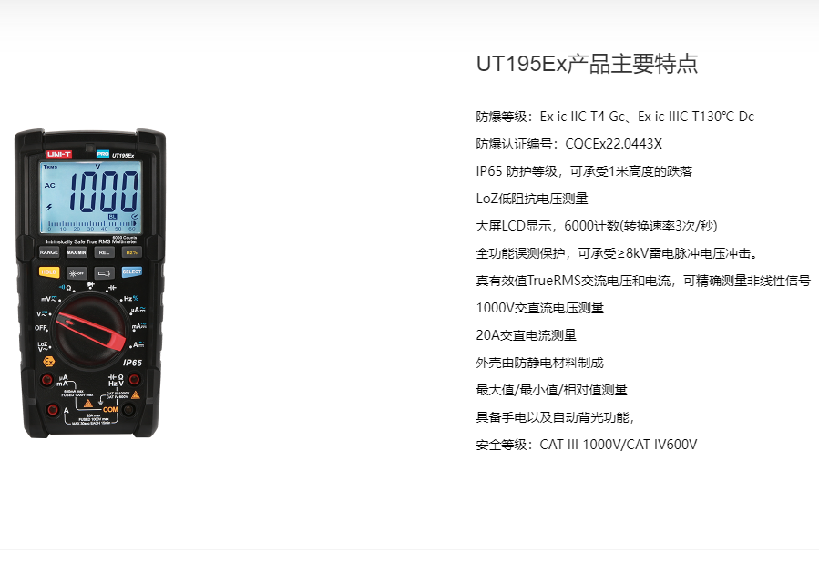 本網(wǎng)頁所展示的有關(guān)【防爆本安型工業(yè)萬用表UT195Ex】的信息/圖片/參數(shù)等由的會員【優(yōu)利德-深圳柏萊科技有限公司 】提供,由柏萊儀器網(wǎng)-專業(yè)銷售儀器儀表服務(wù)商-深圳柏萊科技有限公司會員【優(yōu)利德-深圳柏萊科技有限公司 】自行對信息/圖片/參數(shù)等的真實性、準確性和合法性負責(zé),本平臺(本網(wǎng)站)僅提供展示服務(wù),請謹慎交易,因交易而產(chǎn)生的法律關(guān)系及法律糾紛由您自行協(xié)商解決,本平臺(本網(wǎng)站)對此不承擔(dān)任何責(zé)任。您在本網(wǎng)頁可以瀏覽【防爆本安型工業(yè)萬用表UT195Ex】有關(guān)的信息/圖片/價格等及提供 【防爆本安型工業(yè)萬用表UT195Ex】的商家公司簡介、聯(lián)系方式等信息。