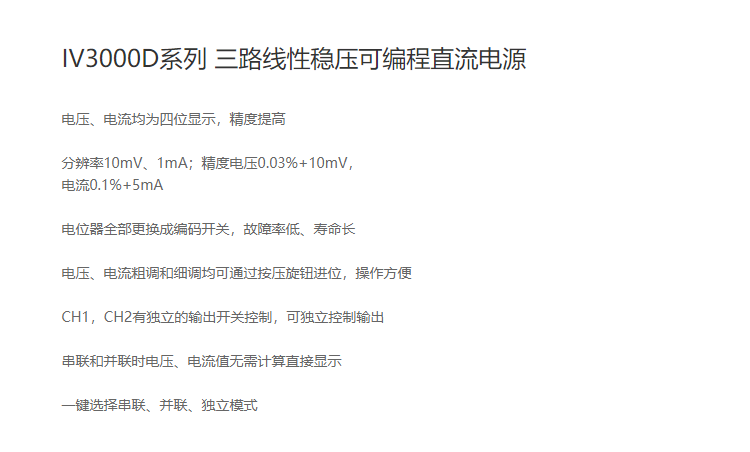 本網(wǎng)頁所展示的有關【三路線性穩(wěn)壓可編程直流電源IV3000D系列】的信息/圖片/參數(shù)等由的會員【艾維泰科-深圳柏萊科技有限公司 】提供,由柏萊儀器網(wǎng)-專業(yè)銷售儀器儀表服務商-深圳柏萊科技有限公司會員【艾維泰科-深圳柏萊科技有限公司 】自行對信息/圖片/參數(shù)等的真實性、準確性和合法性負責,本平臺(本網(wǎng)站)僅提供展示服務,請謹慎交易,因交易而產(chǎn)生的法律關系及法律糾紛由您自行協(xié)商解決,本平臺(本網(wǎng)站)對此不承擔任何責任。您在本網(wǎng)頁可以瀏覽【三路線性穩(wěn)壓可編程直流電源IV3000D系列】有關的信息/圖片/價格等及提供 【三路線性穩(wěn)壓可編程直流電源IV3000D系列】的商家公司簡介、聯(lián)系方式等信息。