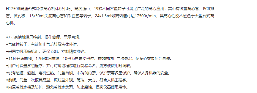 本網(wǎng)頁所展示的有關【H1750R高速臺式冷凍離心機】的信息/圖片/參數(shù)等由的會員【湘儀cence-深圳柏萊科技有限公司 】提供,由柏萊儀器網(wǎng)-專業(yè)銷售儀器儀表服務商-深圳柏萊科技有限公司會員【湘儀cence-深圳柏萊科技有限公司 】自行對信息/圖片/參數(shù)等的真實性、準確性和合法性負責,本平臺(本網(wǎng)站)僅提供展示服務,請謹慎交易,因交易而產(chǎn)生的法律關系及法律糾紛由您自行協(xié)商解決,本平臺(本網(wǎng)站)對此不承擔任何責任。您在本網(wǎng)頁可以瀏覽【H1750R高速臺式冷凍離心機】有關的信息/圖片/價格等及提供 【H1750R高速臺式冷凍離心機】的商家公司簡介、聯(lián)系方式等信息。